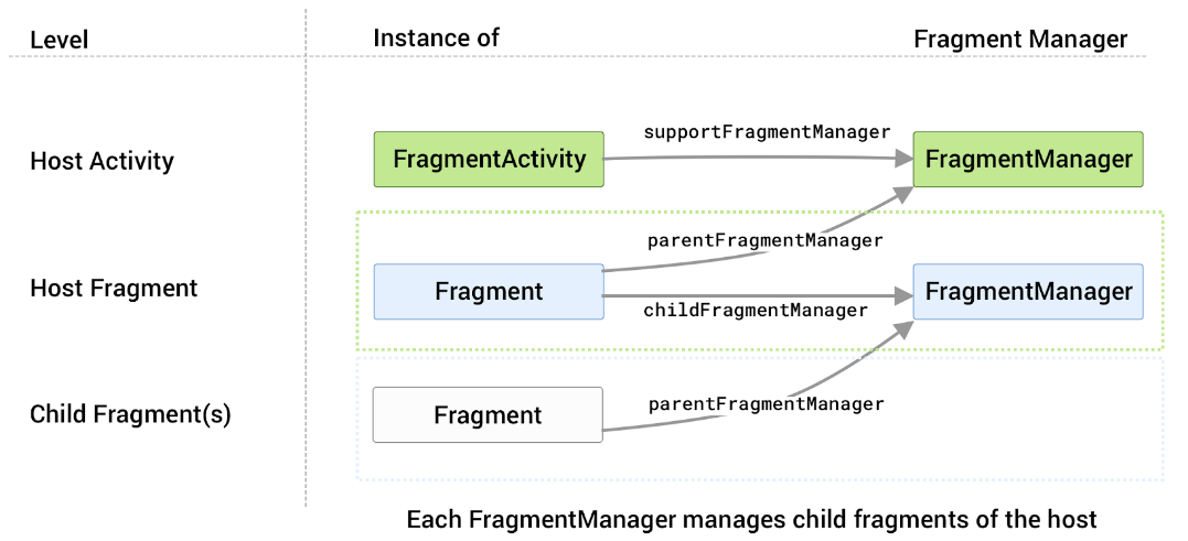 fragment는 activity에 종속적이며, 자식 fragment는 여러개 가질 수 있는데, 이런 상황에서 어떤 fragmentManager를 사용할 지 어려질 때가 있다. 공식문서에서 제공한 아래 그림을 살펴보자